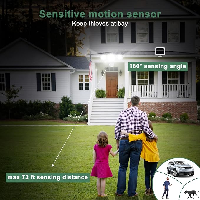 - Motion Sensor Outdoor Lights: The solar motion lights outdoor can accurately sense moving people, animals, cars at a 180° wide motion detection angle. Just an easy turn of stepless adjustable switch, you can customize sensing distance 0-72feet and lighting time 0-120s
