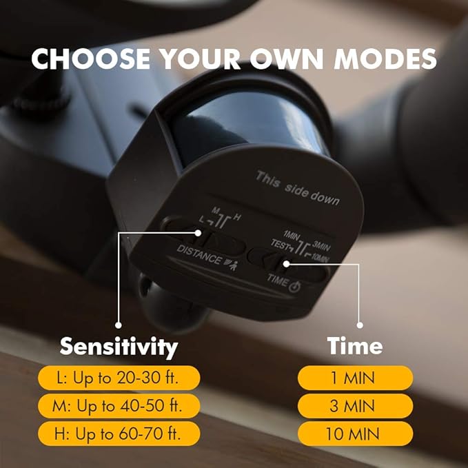 - Motion-Activated: The wide sensing angle of 180degrees detects motion up to 19.69ft-65.62ft away, detecting motion more accurately with its sensitive motion sensor. The adjustable timer can be set for tests, 1, 3 or 10 minutes.