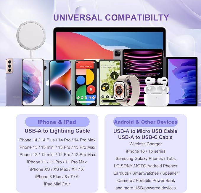 - Compatible Phone Models : Wireless Charger. iPhone 16e / 16 Pro Max / 16 Pro / 16 Plus / 15 Pro Max / 15 Pro / 15 Plus / 15 / 14 Pro Max / 14 Pro / 14 Plus / 14 / 13 Pro Max / 13 Pro / 13 / 13 Mini / SE 3 / 12 Pro Max / 12 Pro / 12 / 12 Mini / 11 / 11 Pro / 11 Pro Max / XS / XS Max / XR / X / 8 7 Plus. iPad / iPad Pro / iPad Air / iPad Mini, AirPods / AirPods Pro. Samsung Galaxy S25 / S24 / S23 / S22 / S21 / S20 / S10 / S9 / S8, Galaxy Note20 / Note10 / Note9, Galaxy A16 / A15 / A14 / A25 / A35 / A55 / A54 / A53 / A51 / A50s / A90 / A80 / A71 / A70s, Galaxy Z Flip 6 5 4 3 / Z Fold 6 5 4 3 2, Galaxy Tab S / A. LG G8 / V60 ThinQ, MOTO G Stylus / G Play / Edge+ / G Power / G Pure. Android Phones & Tablets, Smartwatches, Earbuds, Speaker, Camera, Portable Power Bank, E-reader and more USB-powered devices. Wireless Charger. iPhone 16e / 16 Pro Max / 16 Pro / 16 Plus / 15 Pro Max / 15 Pro / 15 Plus / 15 / 14 Pro Max / 14 Pro / 14 Plus / 14 / 13 Pro Max / 13 Pro / 13 / 13 Mini / SE 3 / 12 Pro Max / 12 Pro / 12 / 12 Mini / 11 / 11 Pro / 11 Pr… See more