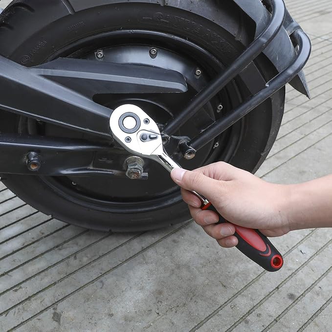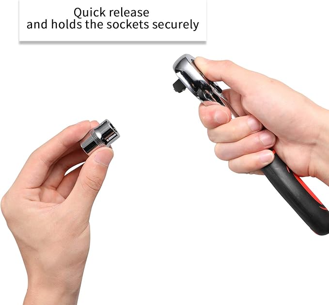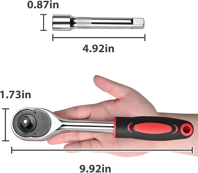 - 1/2" PROFESSIONAL RATCHET HANDLE - Ergonomic easy-grip ratcheting handle could be quickly released, make you comfortably reverse the switch and let the product exceptional durability. The length of the ratchet wrench is 9.92 inches.