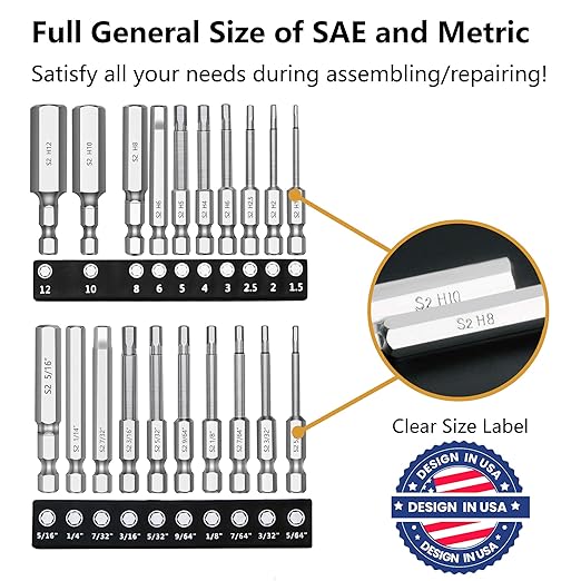 - INDUSTRIAL GRADE QUALITY - The hex drill bits are made from S2 steel material in a matt rust-resistant finish with labeled size marks & magnetic tips. Two portable rubble strips store in a durable plastic case: one packs bits in SAE, another packs bits in Metric