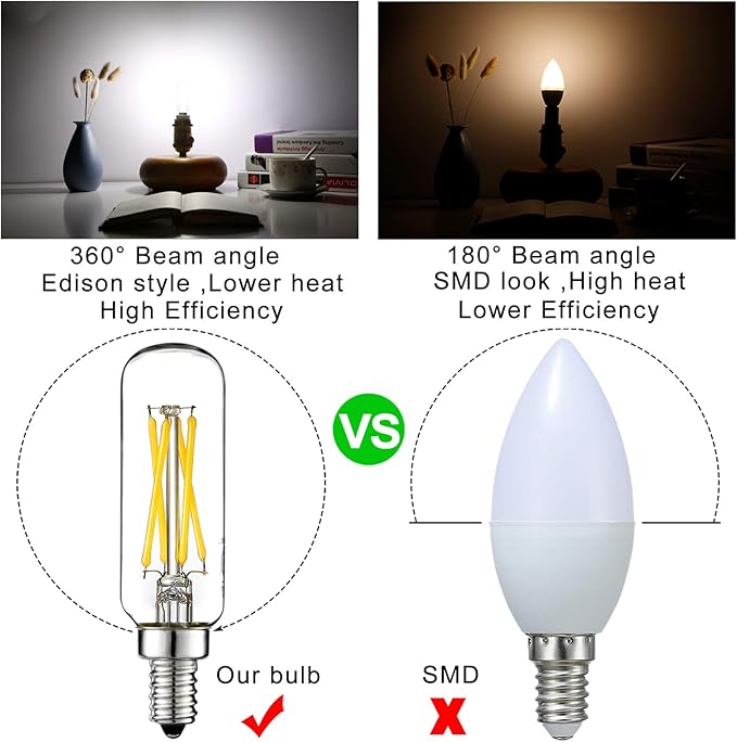 - 【Compact In Size and Energy Saving】:Compact mini candelabra led bulbs suitable for most light fixture with e12 candelabra socket,especially for those in small diameter and height;e12 edison bulb energy saving up to 93%,4W equivalent 40w candelabra bulb,Save your bills with our candelabra light bulbs;ETL,REACH,CE,ROHS approved,mercury-free, non flicker led filament bulb is environment friendly.
