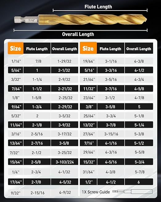 - Organized Holder - This 30-piece set includes 29 drill bits and 1 quick-change adapter. A drill bits holder with size index is included in the set for easy storage and organizing. Sizes include 5/64", 3/32", 7/64", 1/8", 9/64", 5/32", 11/64", 3/16", 13/64", 7/32", 15/64", 1/4", 17/64", 9/32", 19/64", 5/16", 21/64", 11/32", 23/64", 3/8", 25/64", 13/32", 27/64", 7/16", 29/64", 15/32", 31/64", 1/2".