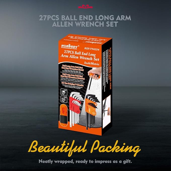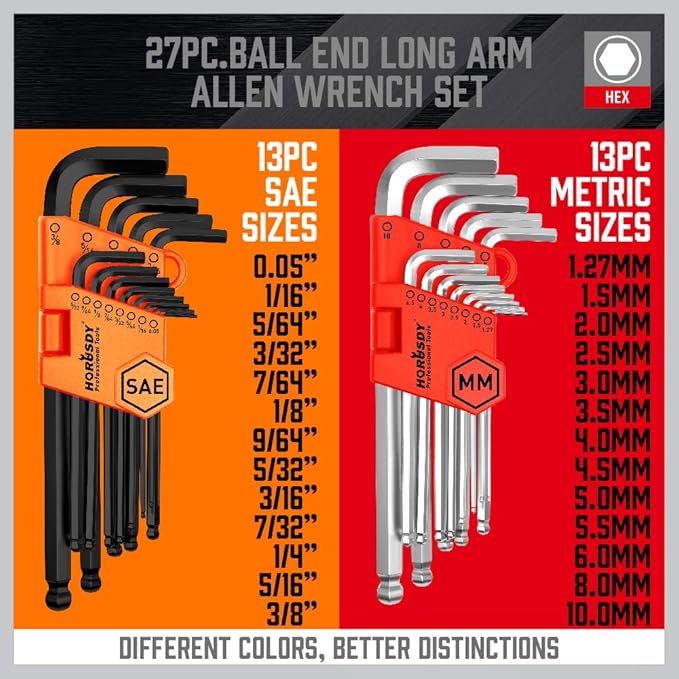 HORUSDY 27PCS Durable Hex Key Allen Wrench Long Arm Set with Ball End, Metric and Standard Sizes Allen Key Set with Another T Handle, Heat-treated CR-V Steel