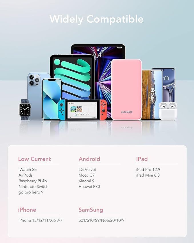 - ๐ใHigh-Speed Chargingใ: 25% charging speed faster compared to similar versions on the market. 4 smart USB outputs get the fastest charging by intelligently detecting and regulating the charging current. Provides a total 5.4A output to charge up to 4 devices simultaneously with Charmast battery pack. The versatile USB-C port supports fast input and output. Long-lasting portable charger for iPhone, iPad, Samsung Pixel More