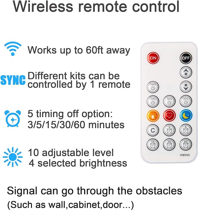 - RF Wireless remote control: 17 Key RF remote has timing off,dimming,hot buttons,rematch and dynamic function,60 feet control distance