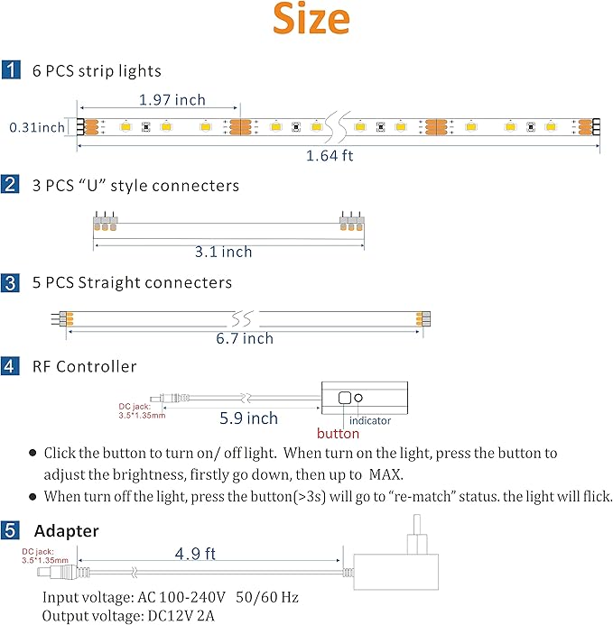 - DIY LED light strip: 6 PCS pre-cut strips, total 9.8 ft,many kinds of connection option,Great way to upgrade your cabinets,closet,desk,tv back,bookshelf,bed,wardrobe,display case,bedroom,workbench etc