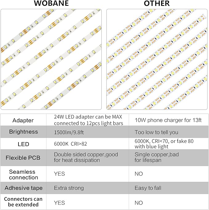 - Reliable kit: High quality adapter and strip light,The LED tape light working voltage is DC12 V,extremely Low voltage and heat.24W adapter can be Max connected to a total of 14PCS (22.96ft )WOBANE LED light bar