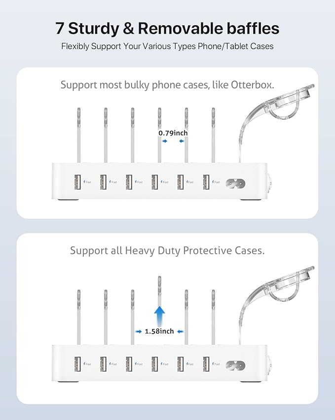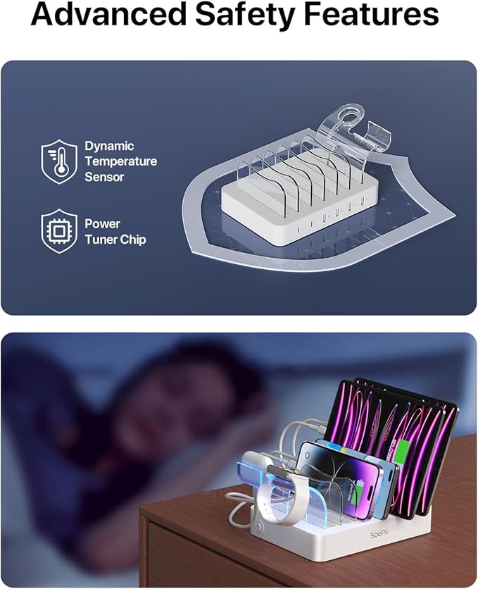 - 【What You Can Get】 1- SooPii Charging Station, 7 strong baffles for phones and tablets,1 baffle Holder for iWatch Charger & Air-pods (iWatch Charger is not included in package) and 6-Pack short Mixed charging cables (2pc for lPhone & lPad,2pc Type C,2pc Micro) for your daily use,user manual.