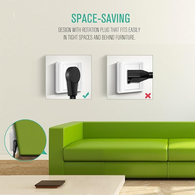- 【360° Rotating Plug】Our 3 prong extension cord features a 360° rotating flat plug adapter that allows access to the outlet from any direction without unnecessary turning! You can easily push furniture against the wall without worrying about damaged plugs.