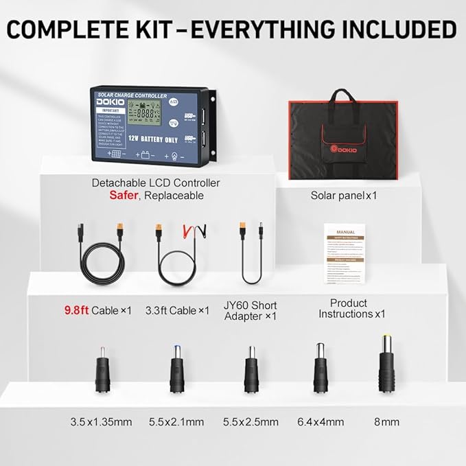 - 【COMPLETE BUNDLE, READY TO GO】 Includes 200W foldable panel, standalone controller, SAE/XT60/alligator clips, 4 DC adapters (3.5×1.35mm / 5.5×2.1mm / 5.5×2.5mm / 8.0mm), 9.8ft cable, storage bag, and manual—everything you need for quick setup out of the box.