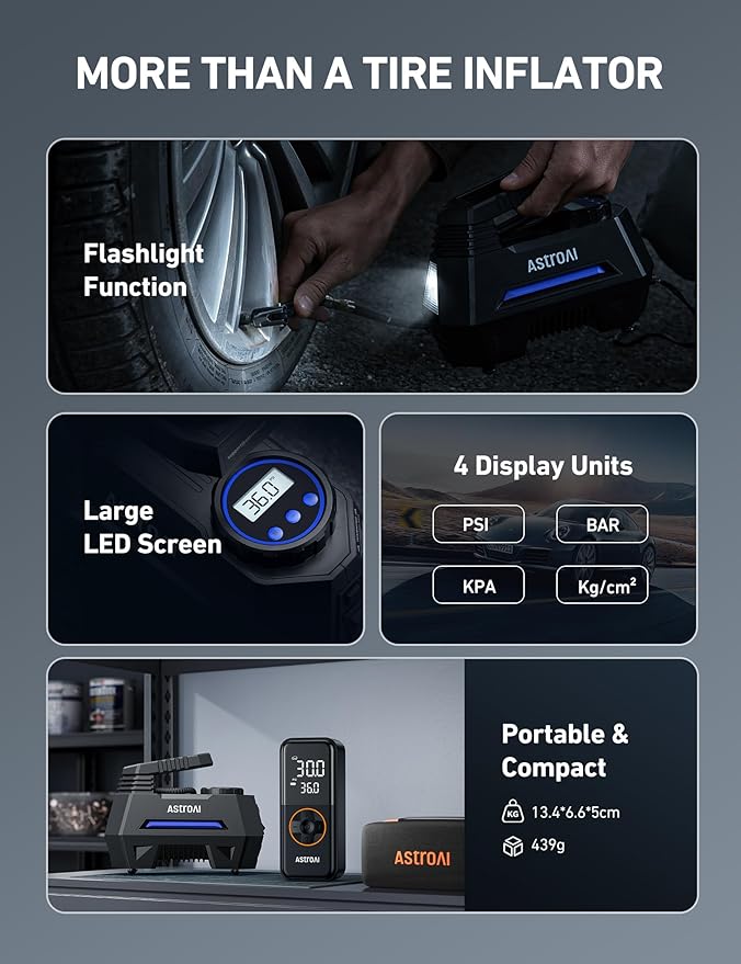 - EASY NIGHTTIME USE: Equipped with a backlit screen and a flashlight, this tire inflator brings convenient use, even in dim environments. Its independent LED Button enables one-press flashlight operation. Great gifts for men and women.