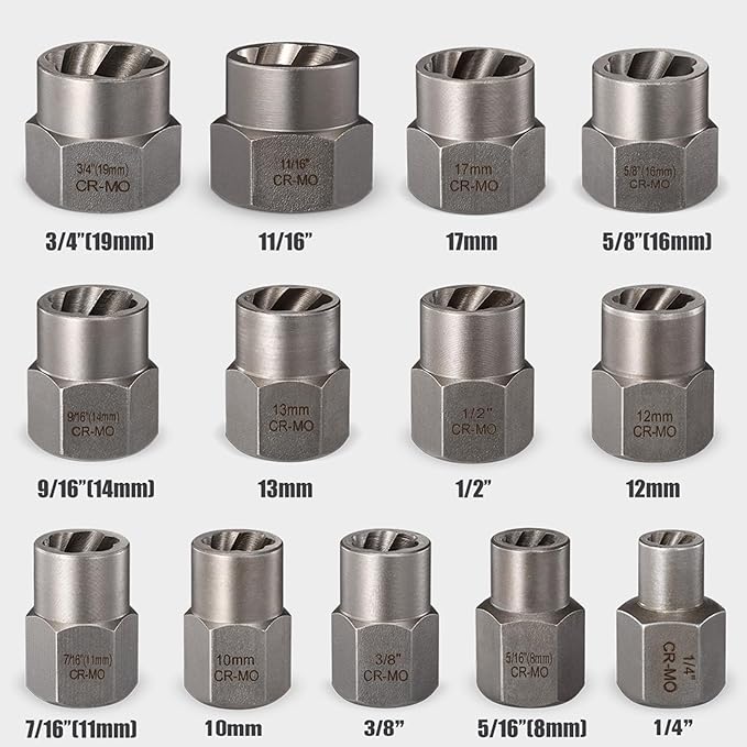 - 13 pieces 3/8 inch drive bolt & nut remover comes with 3/4"(19mm), 11/16", 17mm, 5/8"(16mm), 9/16"(14mm), 13mm, 1/2", 12mm, 7/16"(11mm), 10mm, 3/8", 5/16"(8mm), 1/4",1 piece hex shank socket adapter