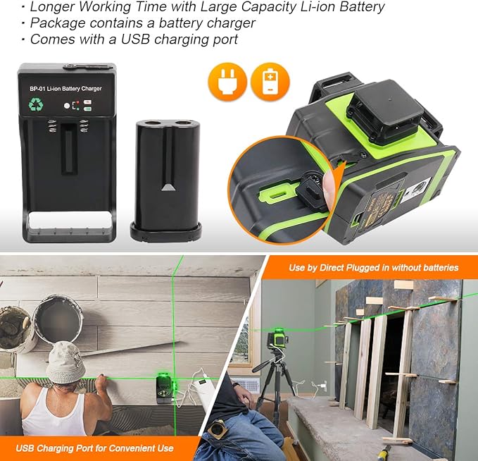 - 【Dual Power Methods & USB Charging Port】: Huepar GF360G Laser Level employed a large capacity of 3.7V / 5200mAh Li-ion Battery and provides long running time. The Li-ion Battery can be recharged in the battery charger (included in the package) separately as well as in the laser tool. When taking out the battery, the cross line laser level can be used at the job site by plugged in directly. The power indicator on the charger and keypad allow users to know the charging status