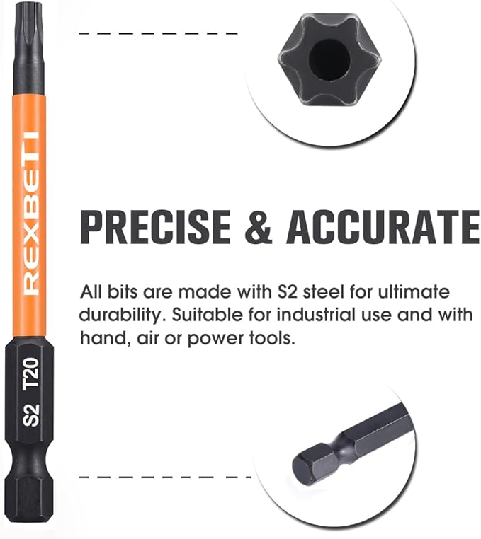 REXBETI 12 Piece Torx Head Screwdriver Bit Set, 1/4 Inch Hex Shank S2 Steel Magnetic 3 Inch Long Drill Bits, T5-T40 (Torx Head)