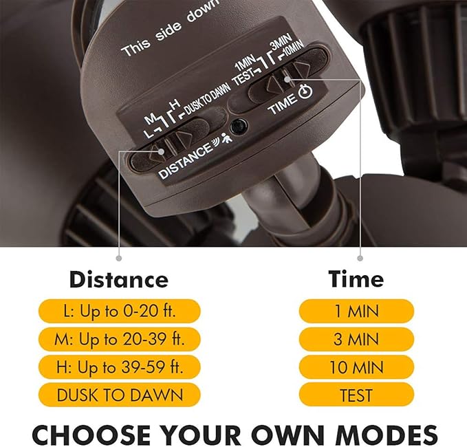 - PIR motion sensor - The security light turn on automatically when motion is detected, with 180° large sensing angle. L(0-20ft), M(20-39ft), H(39-59ft) three ranges of sensing distance along with 1, 3, 10min three lighting durations can be adjusted seperately.