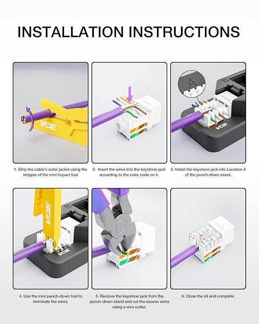 - VCE rj45 keystone jacks can be used for wiring your home, stabilizing connectors, and they are easy to wire and punch down. For patch panels, surface mount boxes, or wall plates (face plates) with standard keystone ports, the RJ45 couplers can snap right into the faceplates and hold tightly.