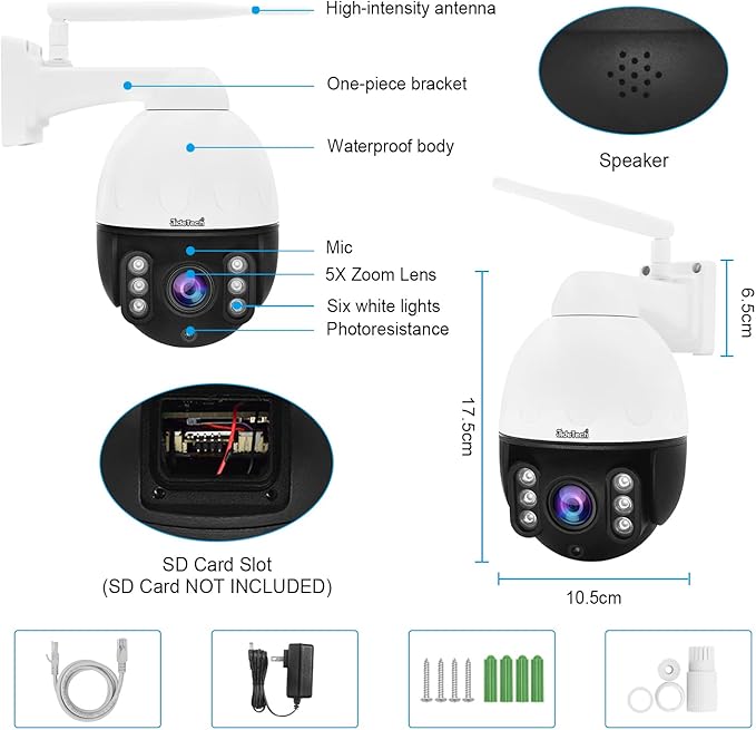 - 【Alarm Push & After-Sale Guarantee】When an alarm is triggered, the outdoor PTZ security camera will record the 15S alarm video to the SD card and immediately send the notification to the cellphone and your email or FTP. If you have any problem with your dome camera, Please feel free to contact us, we will provide high-quality after-sales service in a timely manner