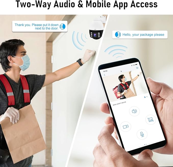 - 【Two-Way Audio & Powerful Compatibility】This WiFi security camera with built-in microphone and speaker for outdoor use and anti-noise technology to ensure smooth and clear voice communication between the APP and the camera side. Support IE,Google and Firefox browsers .Supports multi-user sharing.