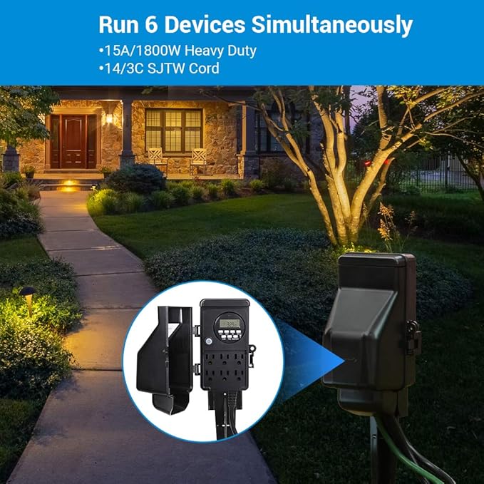 - 【6 Grounded Outlets & 6ft Cord】The outdoor power stake timer has 6 grounded outlets, controlled by the same procedure; 6 ft extension cord provides a larger installation range