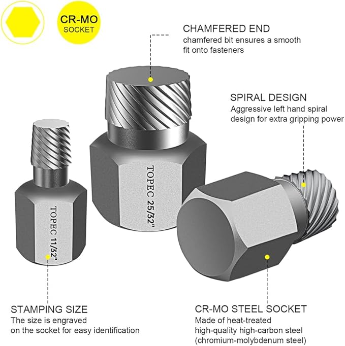 - Easy To Use - All the size is engraved clearly on ach easy out bolt extractor for easy identification. Hex head with multi-spline spiral design provides maximum torque with wrenches and sockets