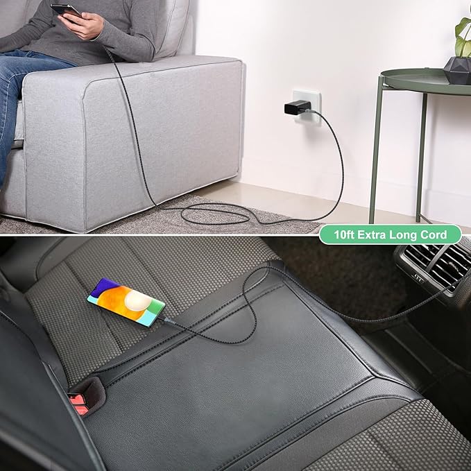 - ★★10Ft USB-C Cable Included: Comes with a 10-feet USB-C cable which is long enough to let you lie on the bed, stay on the sofa during charging. The nylon braided cover makes it tangle-free and durable. Prolonged SR protector extends its bending lifespan. This USB C charger supports fast charging, it’s a great partner of adaptive fast charger. The speed of data transfer can be up to 480Mb/s, without any error message, helps you work efficiently.