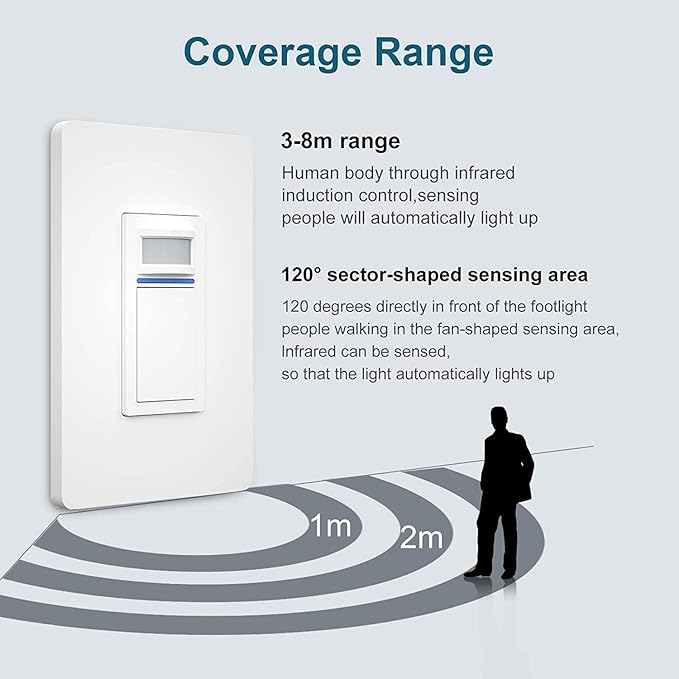 - 【Wide- Application】The Single Pole / 3-Way PIR sensor detects motion with a 120° field of view and the detection distance is 23ft coverage,strong sensitivity. Turn an ordinary switch into motion-sensing hands-free switch. Ideal for laundry rooms, kitchens, entryways, mudrooms, hallways and more. .