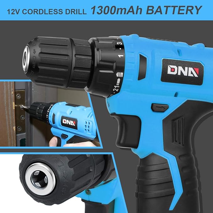 DNA MOTORING 27pcs 12V 1300mAh Cordless Drill Set, Drill Driver Home Tool Kits Combination Tool Set, Tool Kit with Drill For Home, DIY, Maintenance, Blue, TOOLS-00017