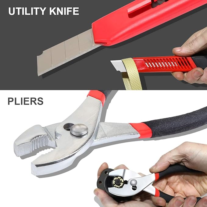 - HOUSEHOLD TOOL SET - Well thought out components that include hammer, knife, scissors, tape measure, pliers, hex keys and screwdrivers.