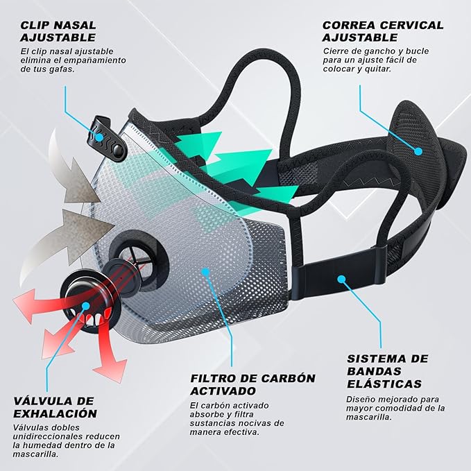- 【BREATHE SMOOTHLY】This air filter mask with valve utilizes high-quality mesh materials that is 11.3% more breathable, strengthens the ability of air circulation, dissipates heat, also reduces moisture inside the mask with filter to ensure smooth breathing