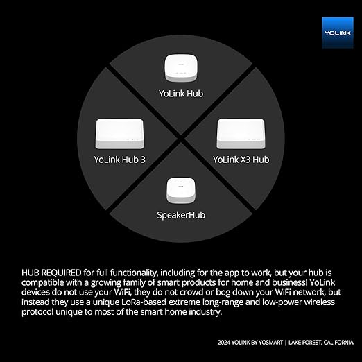 - HUB REQUIRED for full functionality, including for the app to work, but your hub is compatible with a growing family of smart products for home and business! YoLink devices do not use your WiFi, they do not crowd or bog down your WiFi network, but instead they use a unique LoRa-based extreme long-range and low-power wireless protocol unique to most of the smart home industry. Search for B09FSS95G9 for a SpeakerHub (our audio, talking hub) or B07TQLKQLJ for the original Hub.