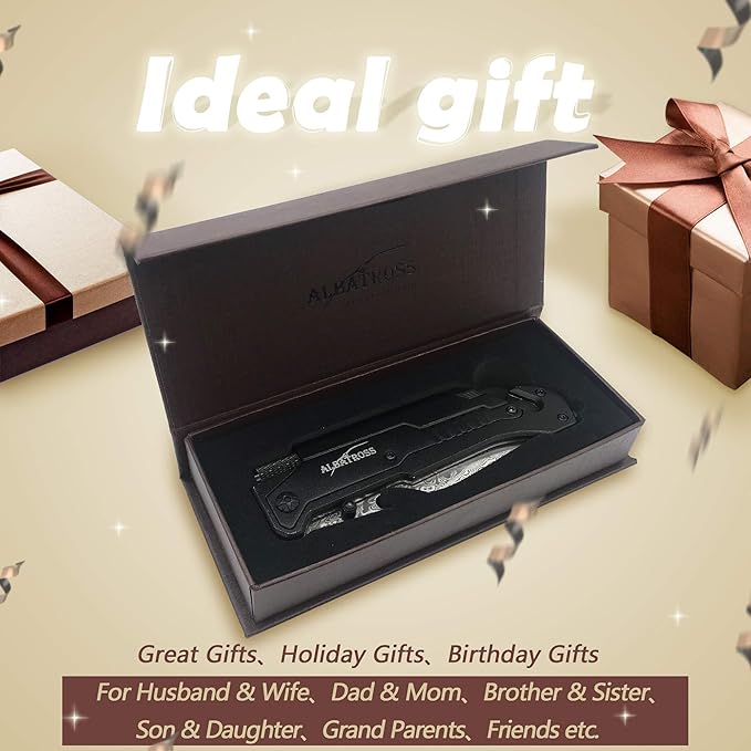 ALBATROSS 6-in-1 Modern Damascus Steel Folding Pocket Knives with LED Light,Seatbelt Cutter,Glass Breaker,Magnesium Fire Starter,Bottle Opener;Multi-Function Emergency Tool(Black-DA)
