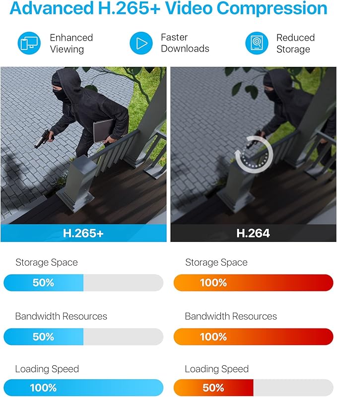 - (3). [ Advanced H.265+ High Efficiency Video Compression ] __ ZOSI self-developed H.265+ video coding technology extract features that focus on characteristics of the surveillance scenes for larger storage space and better image quality. H.265+ can further improve compression ratio on the basis of H.265 standard and save about 80% storage compared with H.264, and thus effectively saving storage resources and provides an excellent and smooth viewing experience.