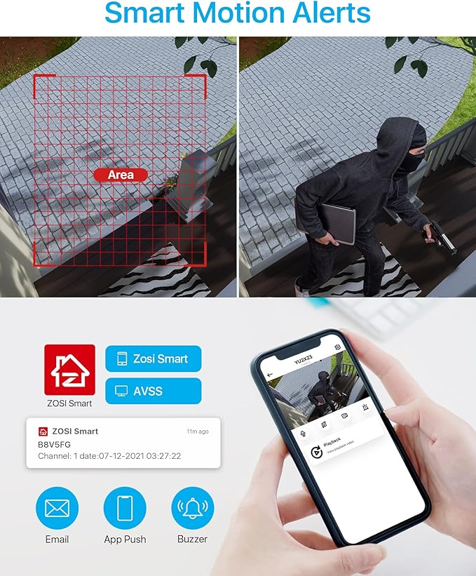 - (2). [ Smart AI Motion Detection & Alerts Push ] __ Enjoy the advantages of AI-powered detection, designed to accurately distinguish between humans and vehicles while reducing false alarms from natural movements such as branches or animals. Customize motion detection zones for each camera to focus on relevant areas and protect your privacy by blocking specific regions from view. You'll receive instant notifications and email alerts whenever the cameras detect movement.