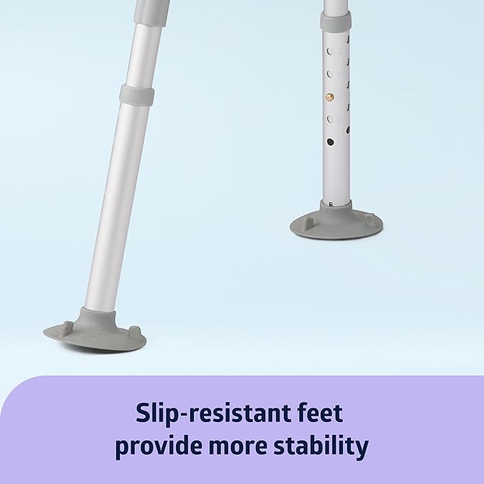 - EASY ADJUSTABLE HEIGHT SETTINGS AND REVERSIBLE BACKREST – Easy push-button design for simple, custom seat height adjustment from 17.5-22”. Reversible backrest fits on either side of seat to accommodate any shower or tub.