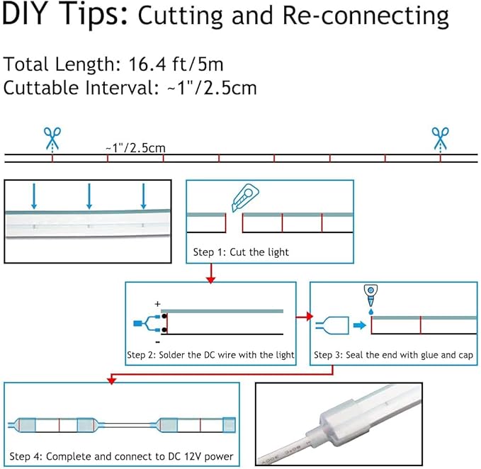 - 【Cuttable & Safe】 Cuttable every 0.98in(2.5cm) with marks on LED strip. You can cut it to DIY special residential decoration or design unique commercial sign. This neon LED strip light works with 12V direct current which makes it low heat. So it is touchable for kids and adults.
