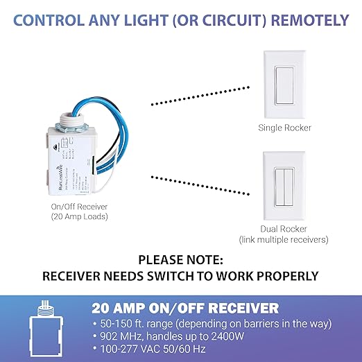 - ✔️ Heavy-Duty Wireless Receiver for Lighting and Appliances Control larger loads like motors, appliances, or multiple light fixtures using this 20A RF receiver. Pairs with RunLessWire kinetic wireless light switches for wire-free operation.