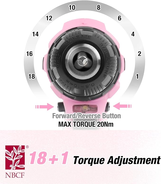 - 18+1 Clutch & 2-Variable Speed: The clutch has 18 different torque settings and drilling modes to avoid incidents where you apply too much power and then wind up stripping the screw. WORKPRO 12V pink drill driver allows you to choose between two-speed settings (0 - 400 RPM or 0 - 1500 RPM), so you will always have the power you need