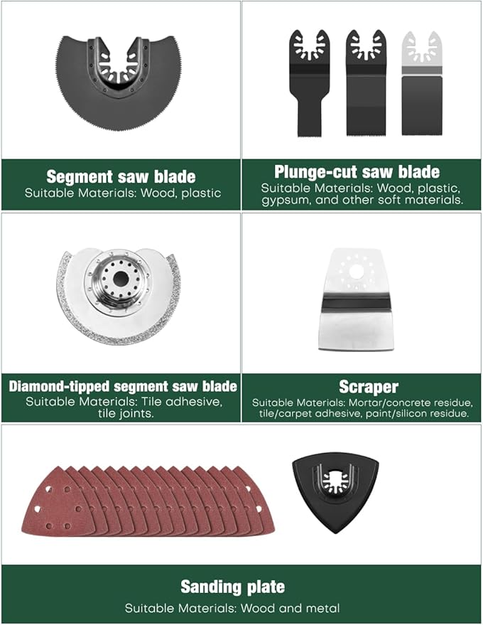 - ใ๐๐๐๐ ๐๐ฎ๐ฅ๐ญ๐ข๐ญ๐จ๐จ๐ฅ ๐๐ข๐ญ ๐๐จ๐๐ฌ ๐๐ญ ๐๐ฅ๐ฅใAccessories: Plunge-cut saw blade*3, Segment saw blade*1, Diamond tipped segment saw blade*1, Scraper*1, Sanding plate*1, Sanding sheet*15 (per 5pcs in P60,P80&P120), Handle*1, Depth Guide*1, 20V Li-Ion Battery*1, Charger*1. KIMO cordless oscillating tool with battery allows you to perform various tasks such as cutting, sanding, scraping, grinding, and more. Go with those high performance blades, cut into wood, pipe, sheet rock like butter.