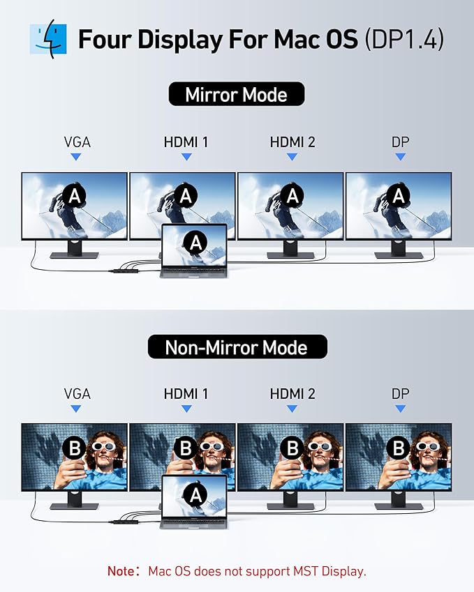 - Docking Station 4K Display Adapter: The usb c hdmi hub for multiple monitors adapter with Dual HDMI Ports and 1 DisplayPort outputs Triple Display up to 4K video. Connects the laptop with a USB-C or Thunderbolt 3/4 port to a monitor (Please make sure that the USB-C port on your laptop supports video transmission. Connecting a VGA display to a Mac may limit all connected screens to 1080P@60Hz resolution. This is caused by macOS driver behavior