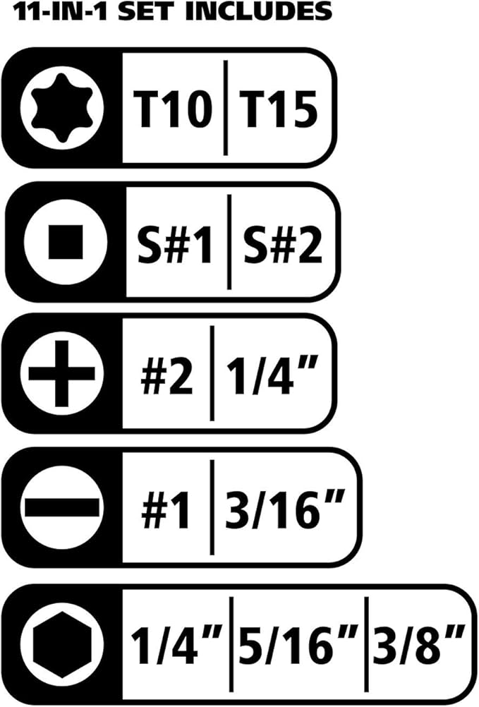 - Includes These Bits: Slotted or flathead screwdrivers bits (3/16", 1/4"), Phillips head screwdriver bits (#1, #2), Square drive bits (#1, #2), and Torx bit (T10, T15)