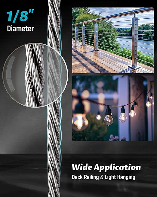 - HIGH STRENGTH: 1/8 inch thin metal wire was constructed by 7 x 7 structure braided cable (7 groups of 7 strands), up to 1800 lbs breaking force with 260 lbs safe tension