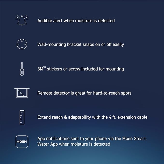 - THREE ALERTS: When water, excess humidity or extreme temperatures are detected, the unit sends an alert via the Flo by Moen app, sounds an audible alarm, or emits a blinking LED light
