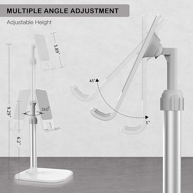 - ADJUSTABLE:This cell phone stand can be easily adjusted to the (0°~ 45°) angle by hand, and it stays firmly in place.The height can be easily adjusted