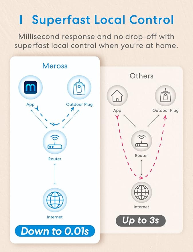 - 3 Independent Outlets Design: Equipped with 3 individually controlled sockets. 3 outlets WORK INDEPENDENTLY of one another. Powered by Mediatek IoT chipset, meross outdoor smart outlet has longer Wi-Fi connection range and lower offline rate. Please also make sure connect your Phone to 2.4GHz home Wi-Fi while setting up the outdoor Wi-Fi plug.