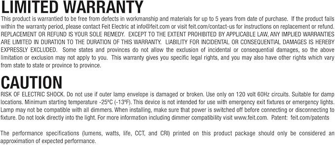 - 2 year warranty - Feit Electric, a US-based trusted brand, has a history of 40+ years in the lighting industry and completes quality testing to ensure this product delivers. Should your product fail within the first two years from the date of purchase our warranty has you protected.