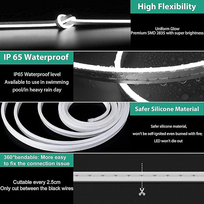 - 【Cuttable & Extendable】- Neon Light Strip: Along a black marker line, cuttable every 0.98", you can cut it to DIY special residential decoration or design a unique commercial sign, 600LEDs create soft decent no-spot fluent lighting inspire your imagination creating different shapes and patterns to bring a stunning lighting effect.