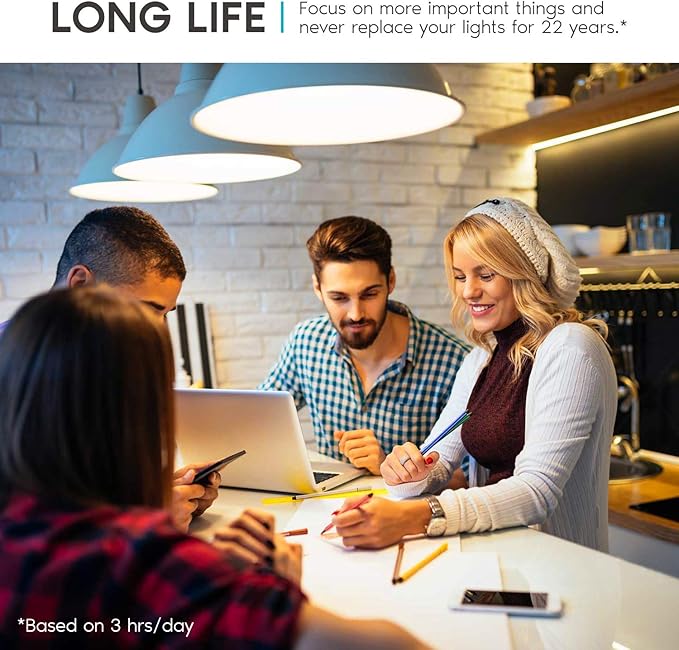 - CONTINUOUS LIGHT - Built with an astounding 25,000 hours of lifetime which means no replacement will be needed for the next 22 years. Each e26 LED bulb lasts 10x longer than traditional 60W incandescent bulbs.