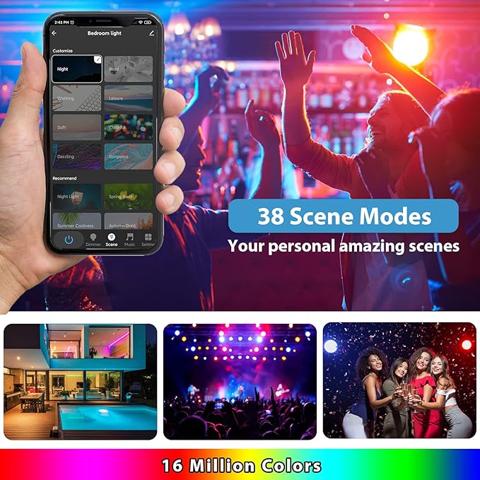- [Upgrade Ultra Smart Flood Light Bulbs ]16W 1600lm (150W Equivalent)color changing light bulb as high wattage,energy saving with upgrade Led chips technology.The colored light bulbs also has high brightness and low luminous attenuation,over 16 million colors to choose,38 scenes DIY, 2700K-6000K warm white to cool white.With FCC,Ce,RoHs certificate and soft light eye protection defaults,the smart recessed light bulbs are much safe to use for bedroom,living room,kitchen,even Stage,Party ect.