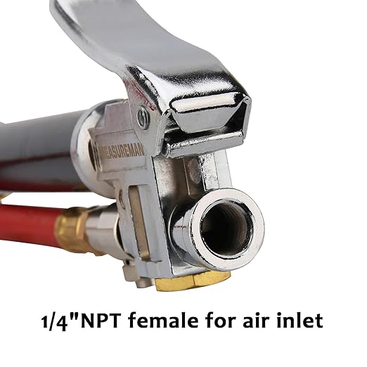 MEASUREMAN Heavy Duty Bayonet Style Tire Inflator, Aluminum Body, 20" Red Hose, Clip On Air Chuck, Aluminum Slide, Range 10-130psi/kpa